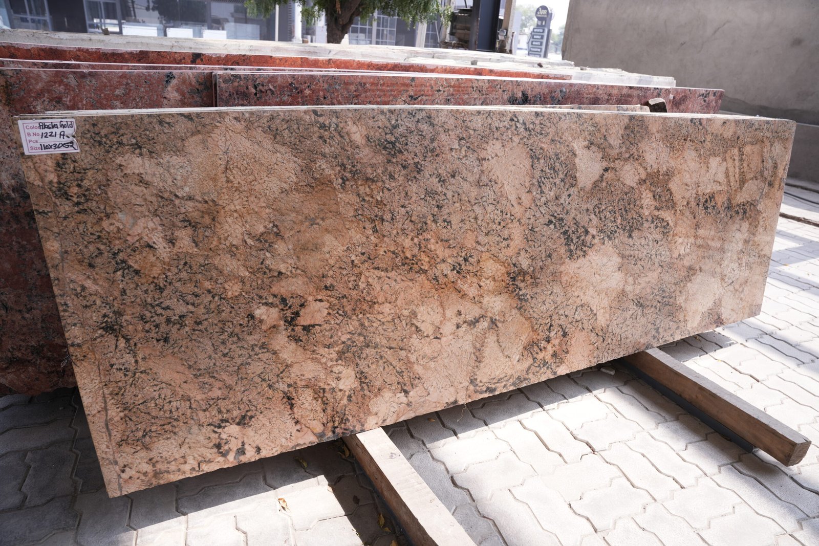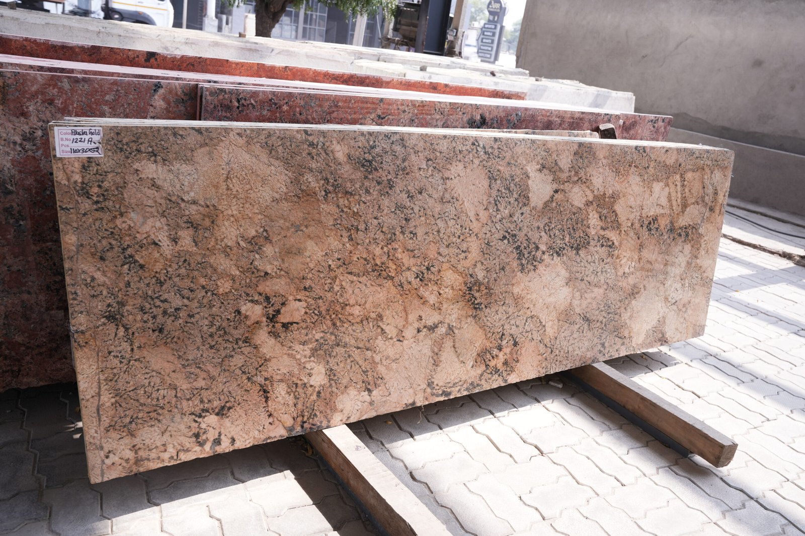 Alaska Gold Granite is a luxurious natural stone that radiates warmth, richness, and timeless elegance. With its golden honey base accented by deep brown and black mineral veining, this granite exudes sophistication and natural charm. Each slab is a masterpiece of earthy tones and intricate crystal formations — a testament to nature’s artistry.