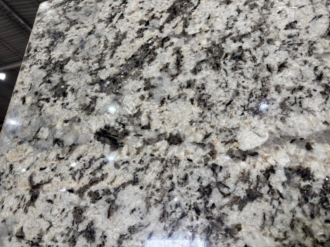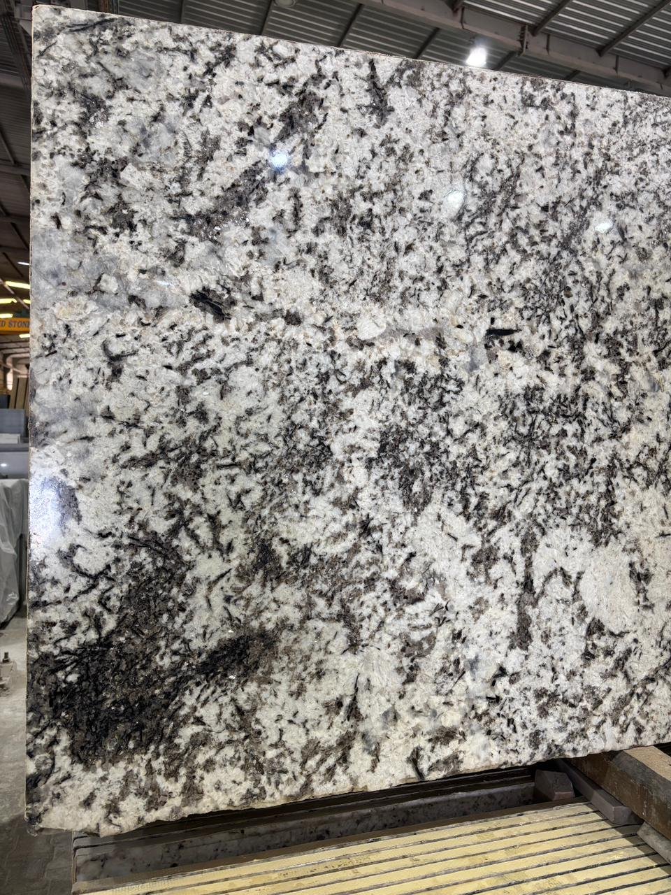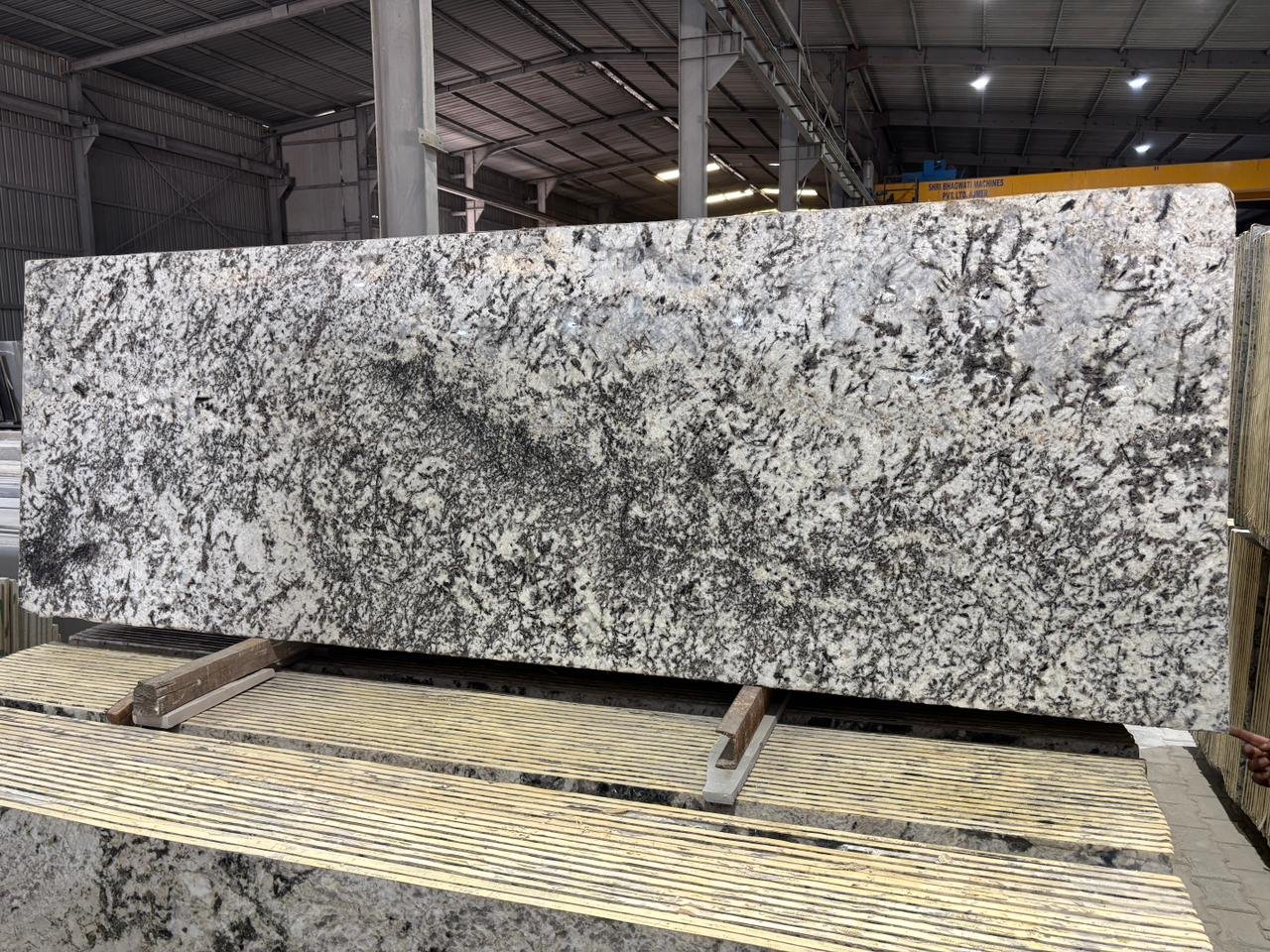 Blue Flower Alaska Granite is a premium natural stone distinguished by its light grey to off-white base, richly textured with dense black, charcoal, and subtle bluish mineral formations. The fine, flower-like granulation creates a balanced and elegant appearance, offering depth without overpowering the space.