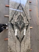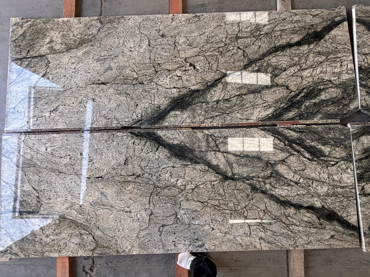 Jasper Green Granite is a striking natural stone featuring a greenish-grey base highlighted by bold black and dark charcoal veining. Its dramatic, web-like patterns create powerful visual movement, especially when book-matched, making it an ideal choice for statement surfaces and feature installations.